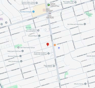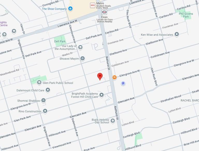 The office is steps from either the Bathurst #7 or Glencairn #14 bus stops, or a 15 minute walk from Glencairn Subway station. There is free parking on site.